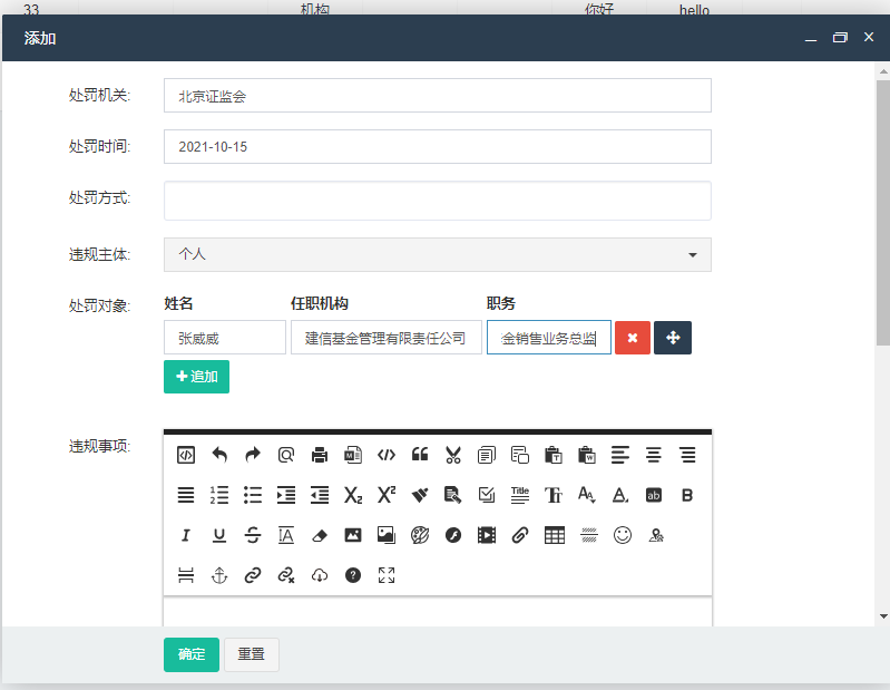 1、证监会处罚案例的关联法规和处罚对象表创建以及新增界面的优化。