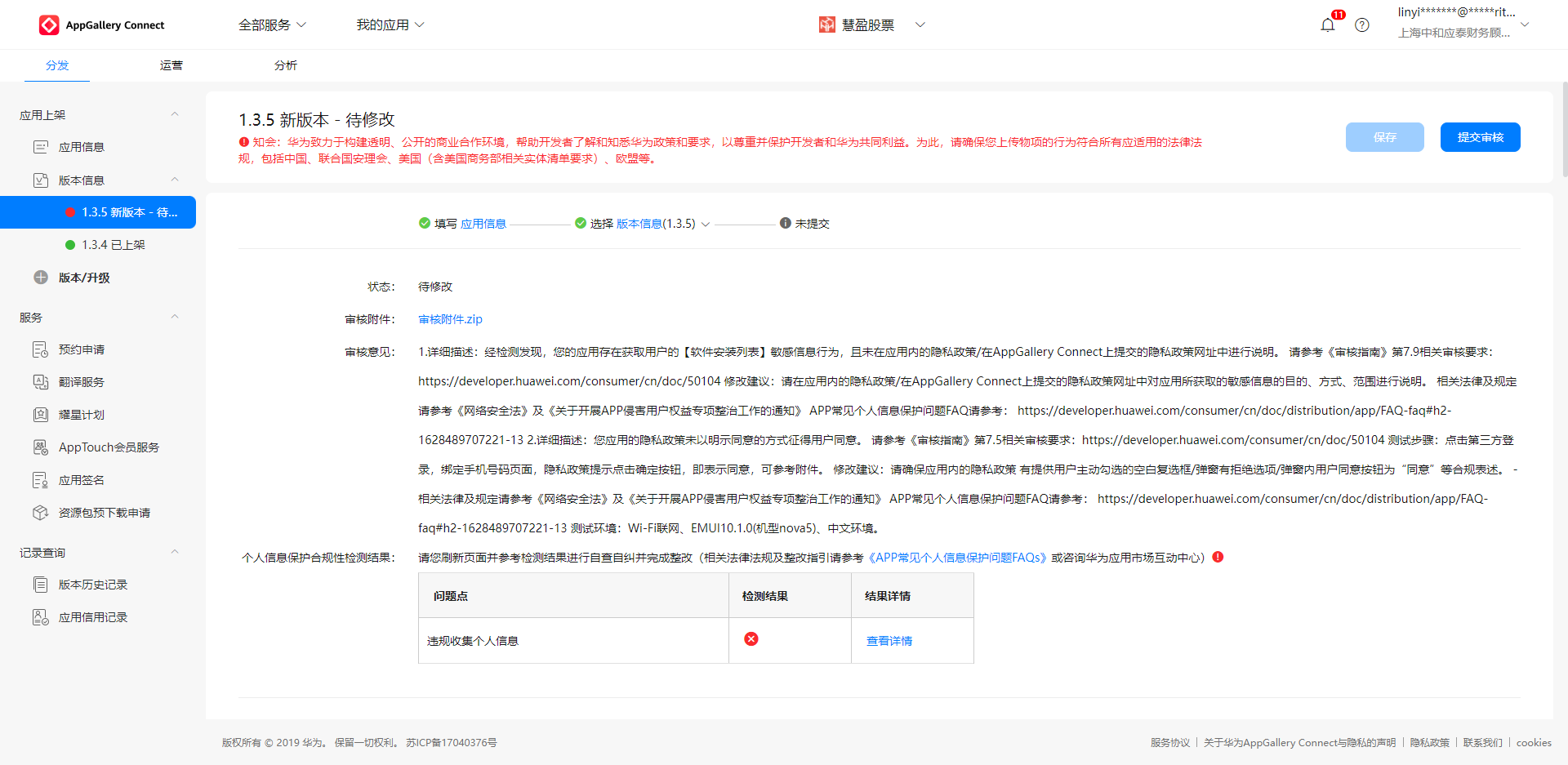 2、慧盈股票1.3.5只有华为审核没通过,隐私政策内容需要修改,新增如下隐私政策内容等待审核