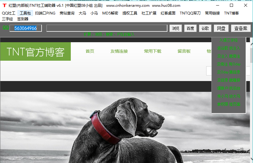 红客联盟网站渗透工具,包含qq社工,工具包(Wsock抓包,WSE抓包,明小子4.3,啊D SQL注入工具,NBSI3.0注入,穿山甲COOKIE注入,注入中转生成器,中国菜刀,灰钮突破,MD5超级解密器,CMD扫后台,挖掘鸡V1.1,VPN代理,穿山甲等)